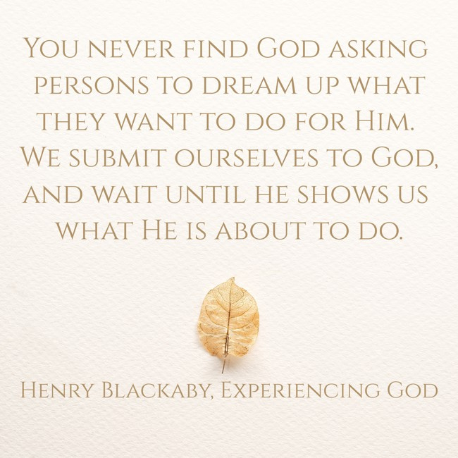 You never find God asking persons to dream up what they want to do for Him. We submit ourselves to God, and wait until he shows us what He is about to do. Or watch and see what God is doing around us and join him.1